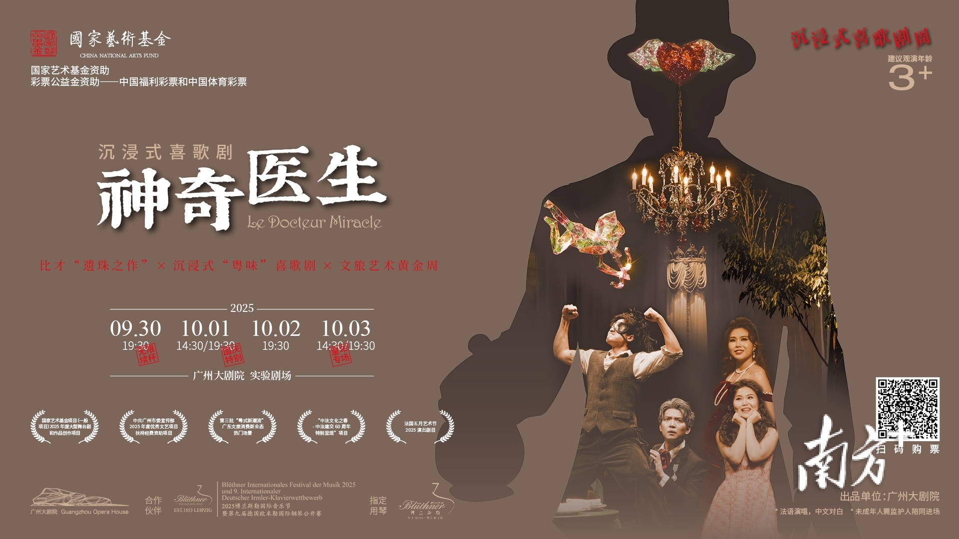 《神奇医生》是沉浸式喜歌剧系列的首部全年龄段作品,也是法国独幕喜歌剧《Le docteu Miracle》自诞生以来的全球首个“沉浸式”版本。该作品融合了童声合唱、芭蕾舞蹈、多媒体与环境艺术等元素,以制作轻量化、场景生活化、语言本土化的特点,探索出歌剧的“广州模式”,构建起城市消费新场景。该作品获选为国家艺术基金 2025 年度大型舞台剧和作品创作项目、2025 年度广州市优秀文艺项目专项经费扶持作品,并被纳入“中法文化之春中法建交 60 周年特别呈现”系列活动、“2025 法国五月艺术节”、第三批“粤式新潮流”广东文旅消费新业态热门场景。同时,现场还原歌剧艺术最初的观剧礼仪,观众可以一边品红酒一边赏歌剧,更融合了“开放剧本”等创新玩法,为观众带来别样的观演体验。